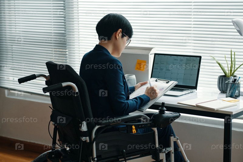 Деловая женщина в инвалидном кресле, работающая с диаграммами
