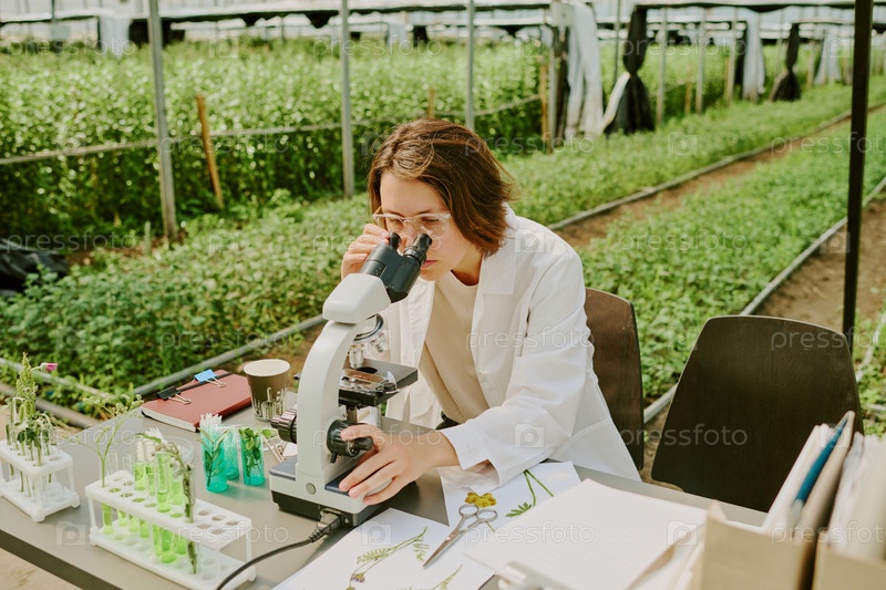 Ученый, изучающий образцы под микроскопом в теплице