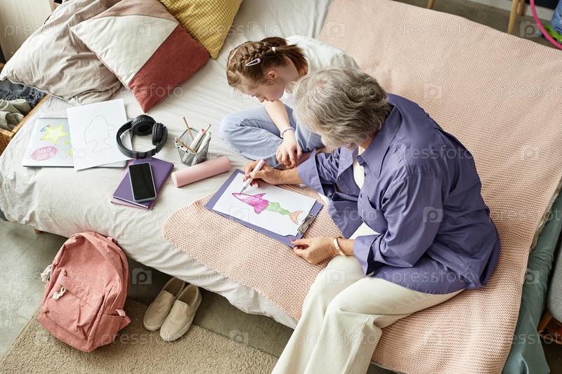 Старшая женщина и ребенок рисуют, сидя на кровати