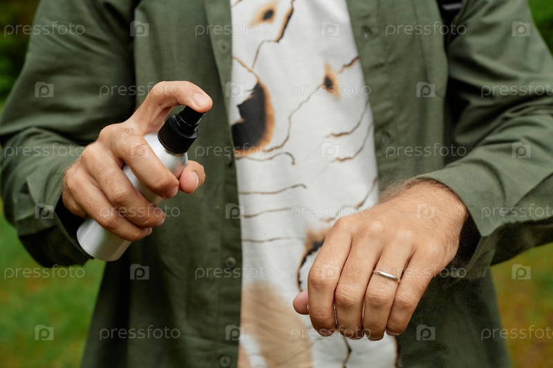 Использование дезинфицирующего средства для рук в наружной обстановке с зеленым фоном
