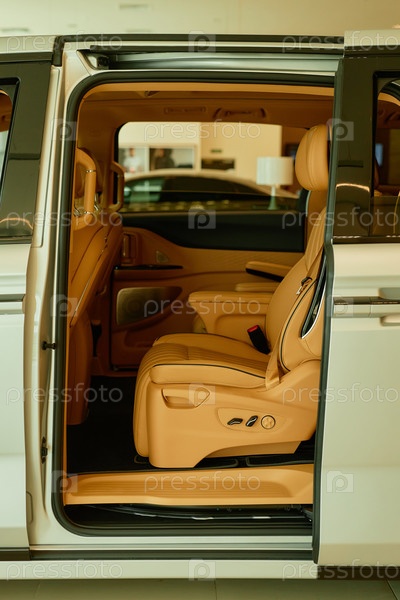 Задние сиденья демонстрационного автомобиля с бежевой кожей кабины в дилерском центре