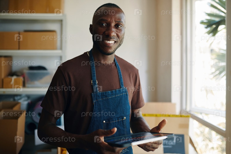 Работник, работающий с онлайн-заказами на планшетном ПК
