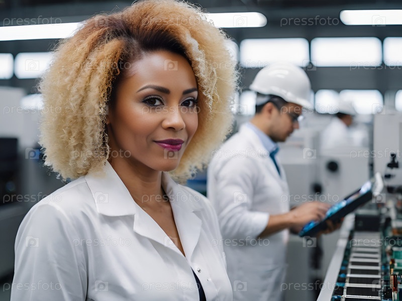 Улыбающаяся бизнесвуменка стоит внутри современной фабрики