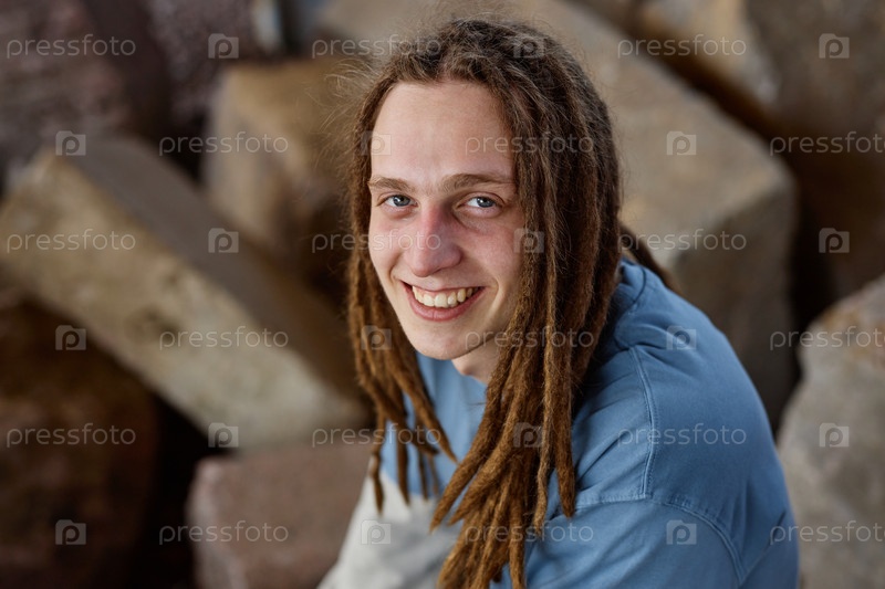 Портрет улыбающегося мужчины с дредольками, сидящего на улице