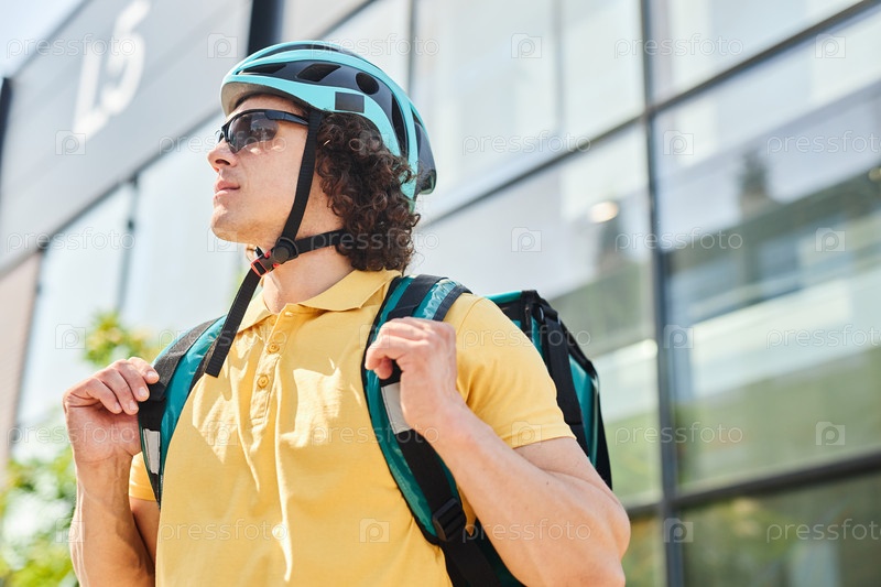 Молодой человек, носящий шлем и рюкзак во время езды на велосипеде