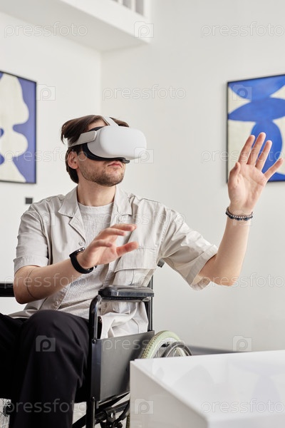 Человек с инвалидностью, использующий произведения искусства VR на доступной художественной выставке
