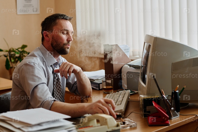 Бизнесмен, использующий компьютер в офисе с современными устройствами