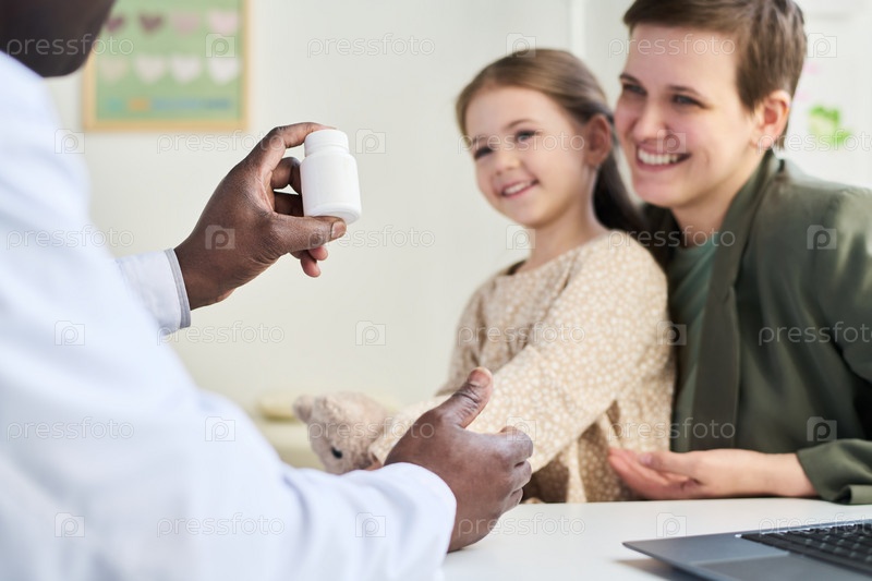 Улыбающаяся семья, посещающая врача и держащая бутылку с рецептом