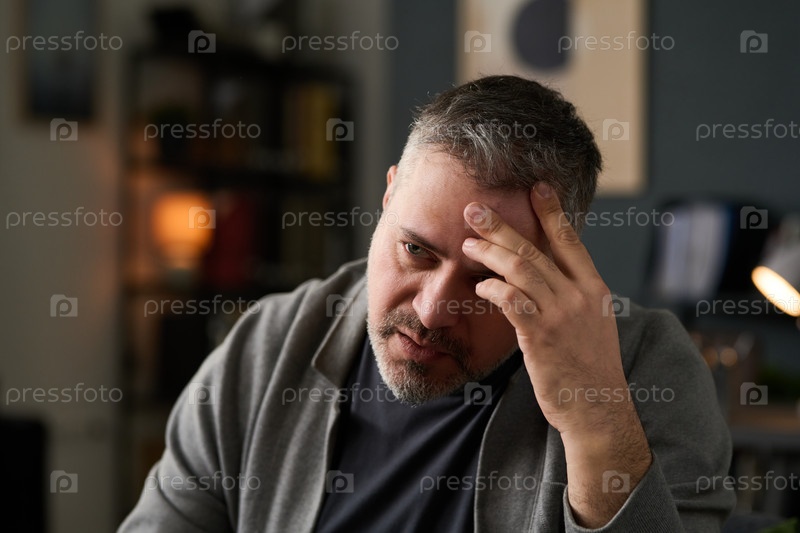Мыслящий мужчина средних лет с рукой на лбу в офисной обстановке