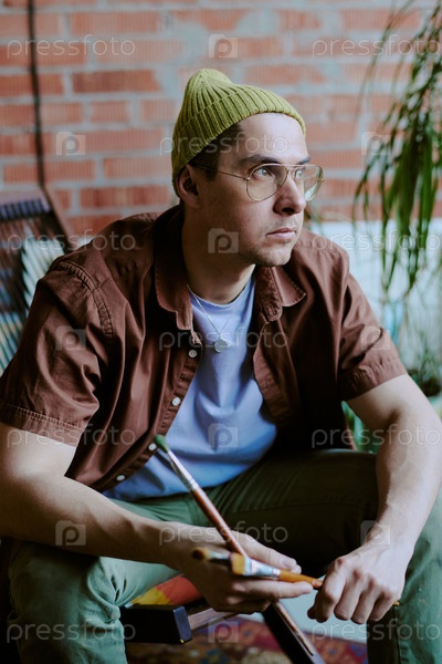 Художник, сидящий на стуле с кистями в руках Мужчина