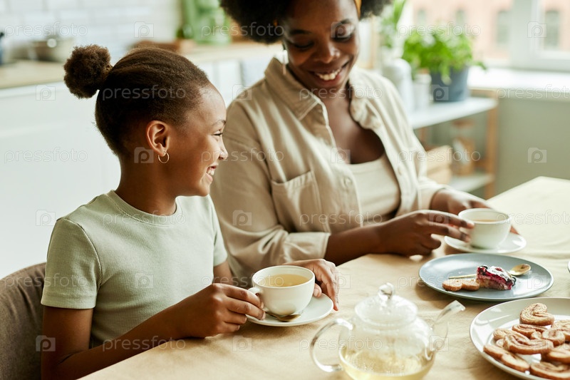 Улыбающаяся черная девушка разговаривает с матерью, пьет чай сидит за кухонным столом