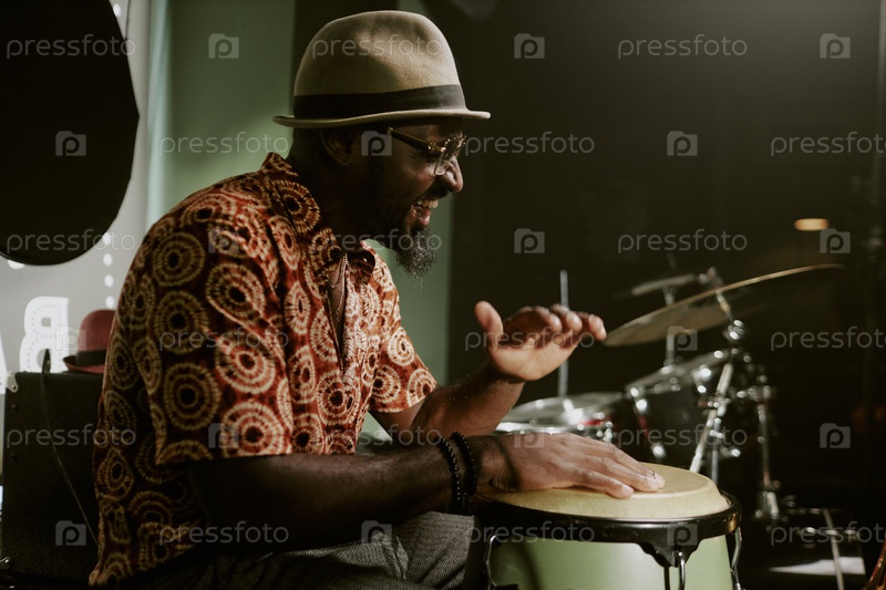 Счастливый бородатый мужчина играет в конгу