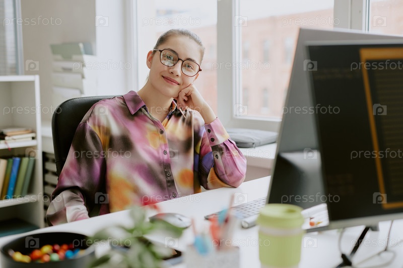 Портрет молодой женщины-программистки в офисе