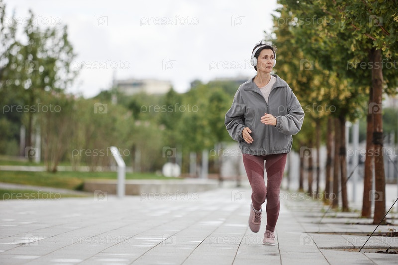 Зрелая женщина в наушниках бегает снаружи по деревьям в городском парке