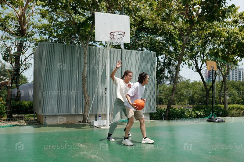 Играть в баскетбол на свежем воздухе в солнечный день с друзьями