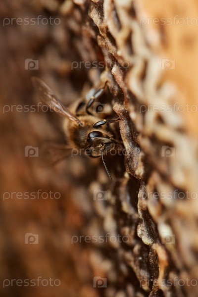Занятая пчела сидит на соломе и производит мед