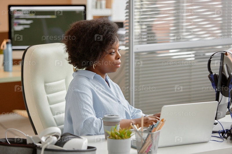 Успешный программист работает в офисе с белым интерьером