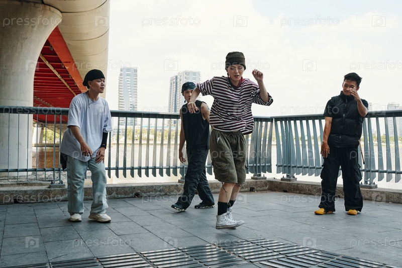 Танцевальная группа под мостом, исполняющая уличную рутину