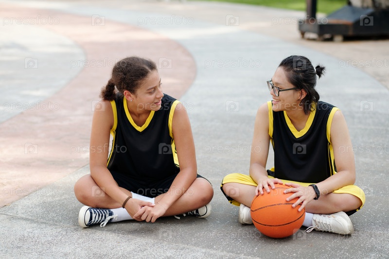Улыбающиеся подростки сидят на баскетбольном корте и улыбаются