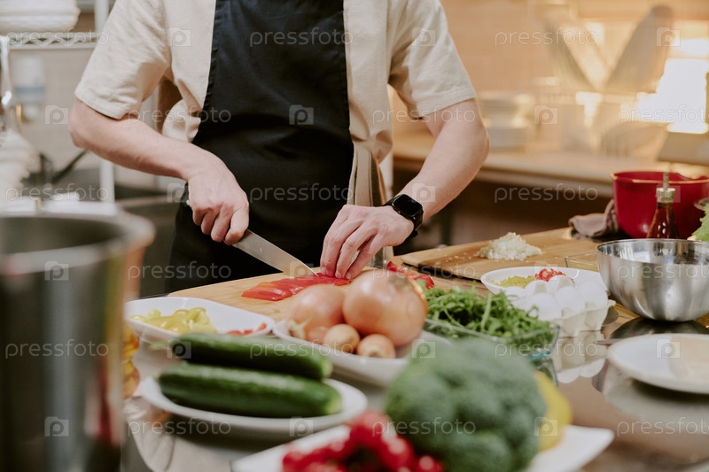 Cook Slicing Bell Pepper Мужчина Кухарка, нарезающая колокольчик Перец мужской