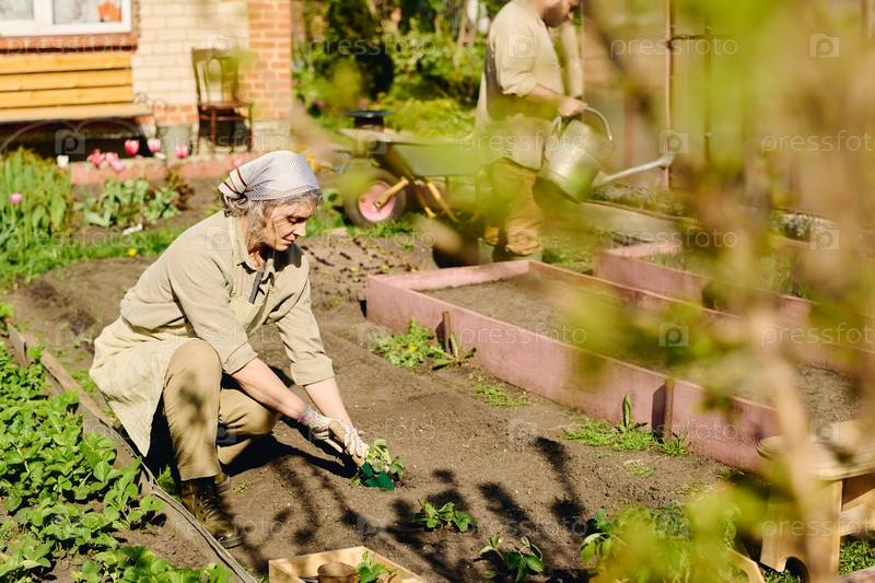 Женщина-фермерка, склонившаяся над цветочным клумбом