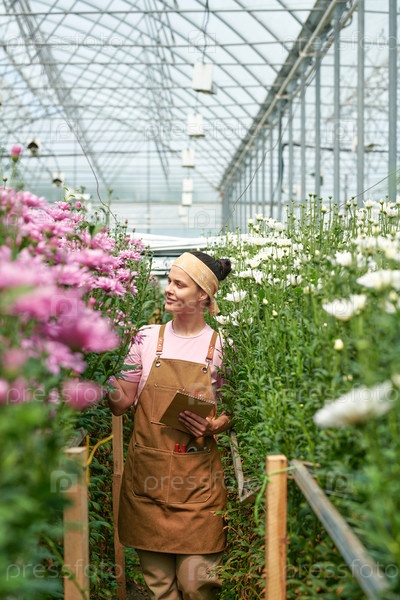 Женщина, работающая на цветочной плантации в теплице, инспектируя растения