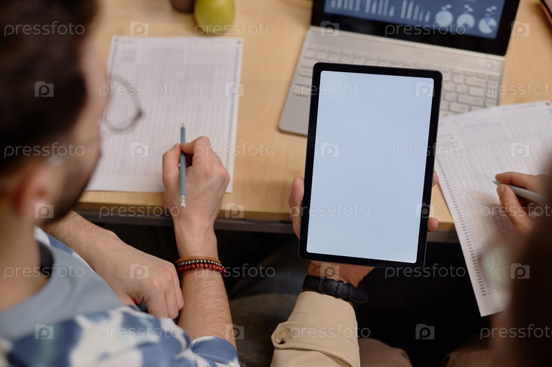 Руки студентов университета с помощью теста на письмо с сенсорной панелью