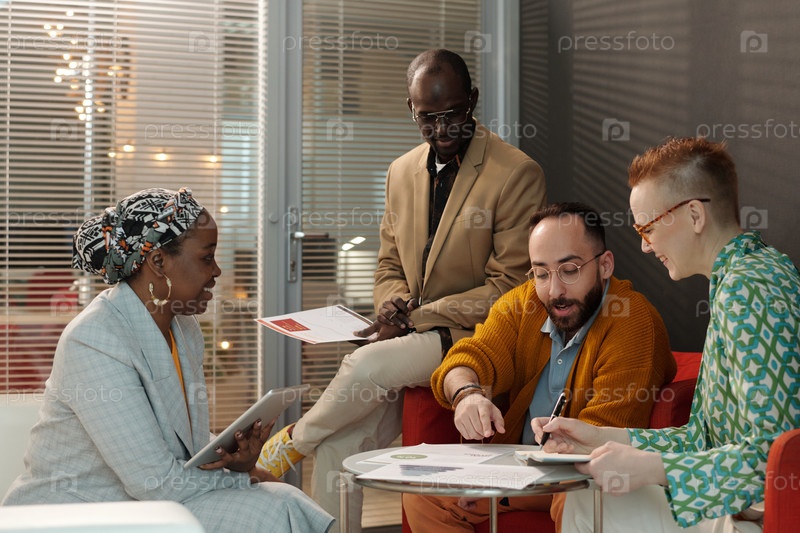 Различные группы просматривают отчеты во время офисной встречи