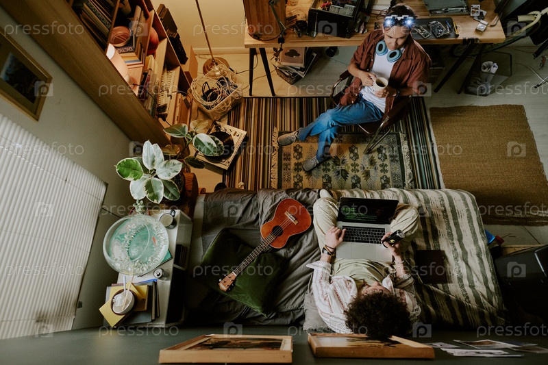 Высокий вид двух соседей по комнате, имеющих перерыв