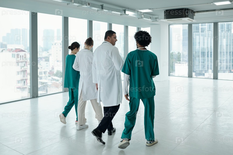 Врачи, идущие вместе в коридоре клиники