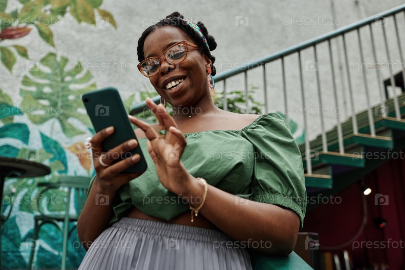 Счастливая афроамериканская женщина, наслаждающаяся социальной сетью