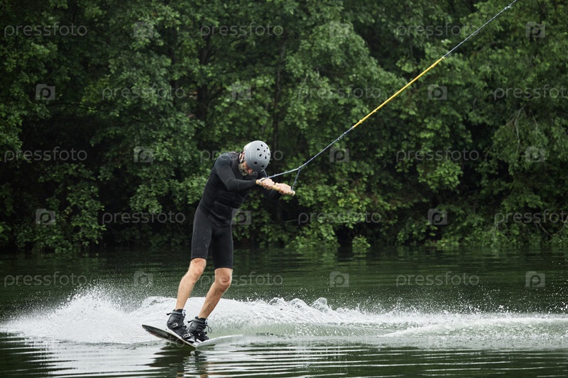 Старший мужчина Wakeboarding на озере с волновой тропой