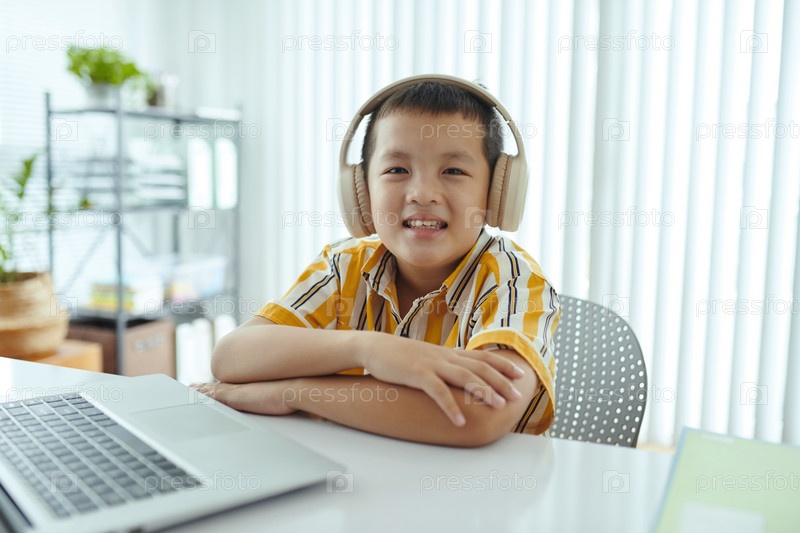 Портрет азиатского ребенка, слушающего музыку с помощью наушников