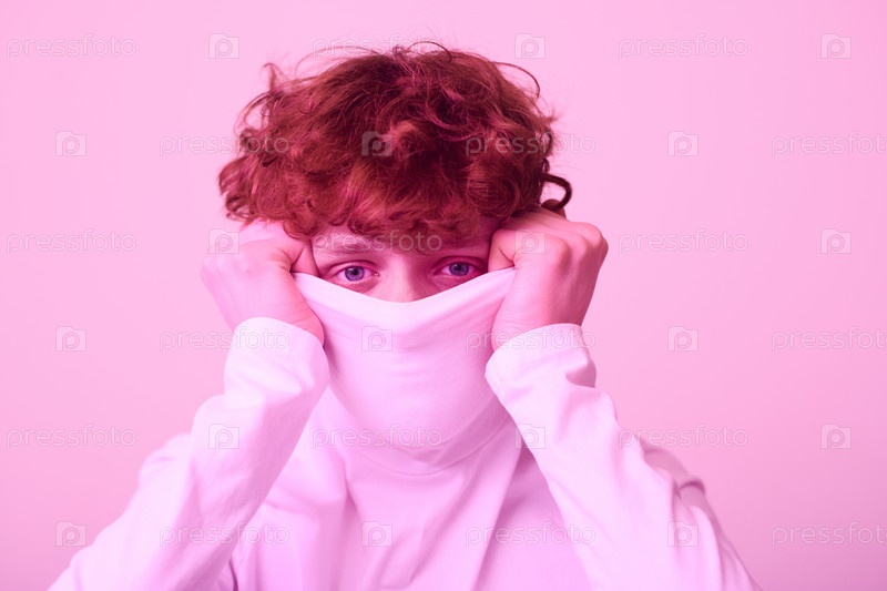 Спрятает лицо за рубашкой, в то время как пристально смотрит