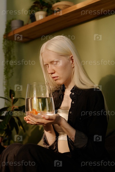 Белокожая девушка со своей домашней золотистой рыбкой