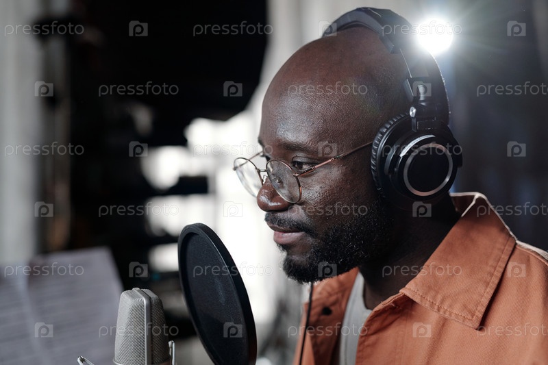 Запись Музыканта, носящего наушники, говорящий в микрофон