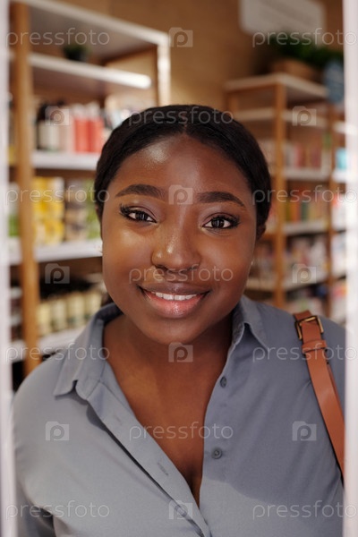 Счастливая женщина-шопполик в синей рубашке