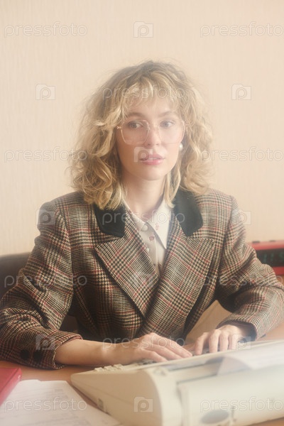 Портрет блондинки с очками, сидящей за рабочим столом