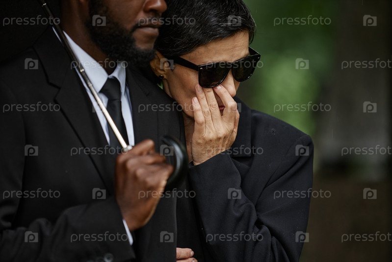 Плачущая пожилая женщина в солнцезащитных очках рядом с мужем на кладбище