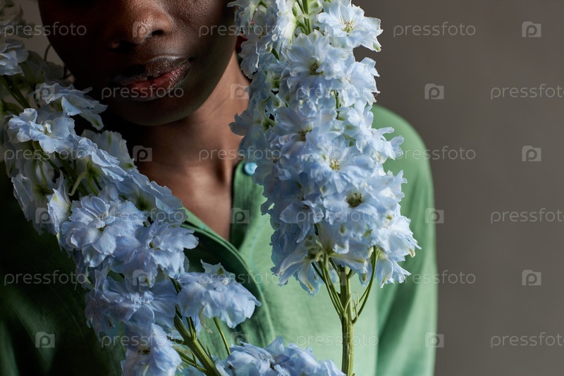 Детальный снимок чернокожей женщины, держащей цветы