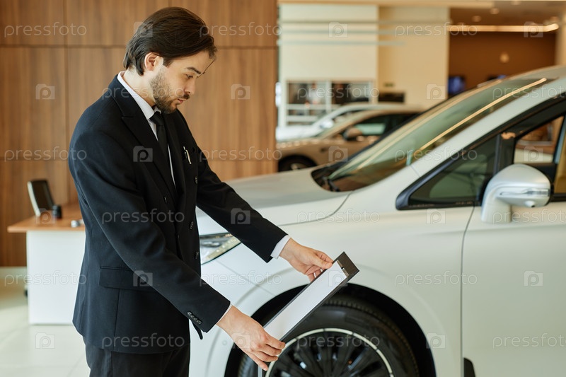 Автодилер читает информацию о стенде в автосалоне Male