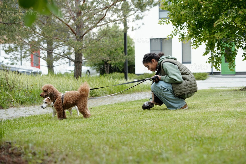 Девушка-подросток удаляет собачьи фекалии в парке