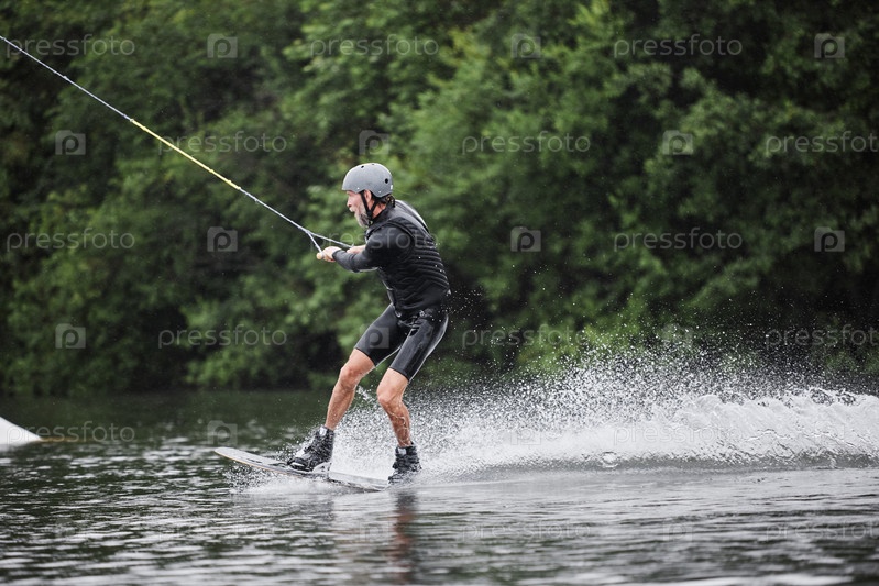 Старший мужчина занимается вейкбордингом на озере, оставляя волновую тропу