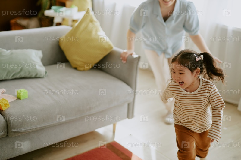 Маленькая девочка смеется, убегая от матери