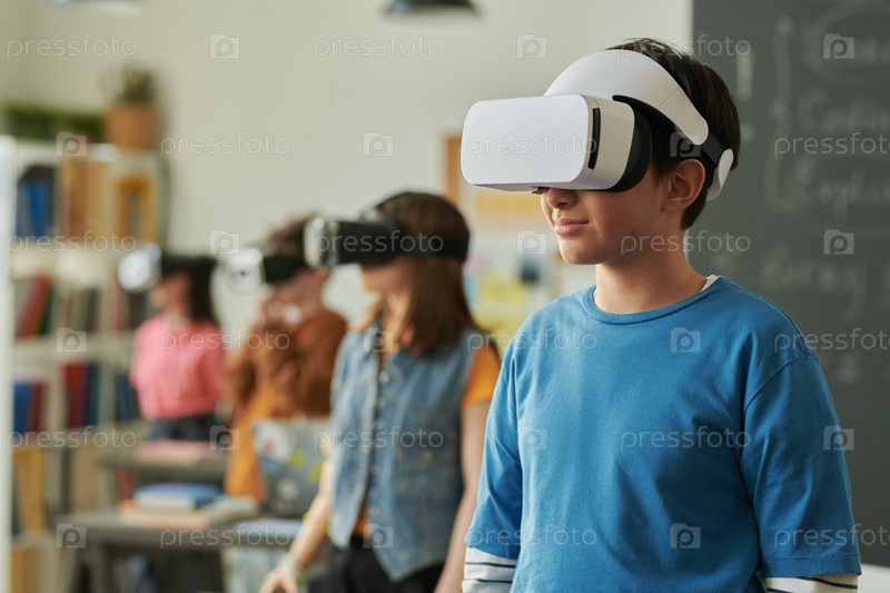 Улыбающийся мальчик, носящий VR с группой детей