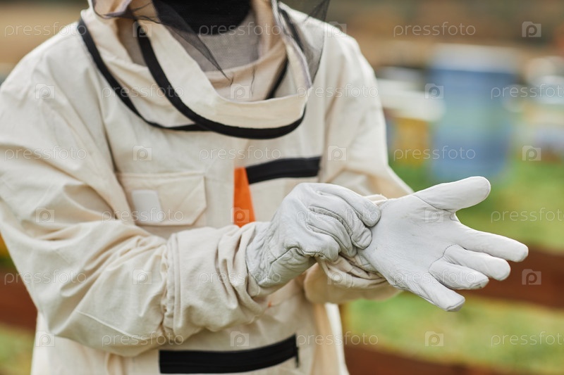 Пчеловод в защитном костюме надевает перчатки на ферму
