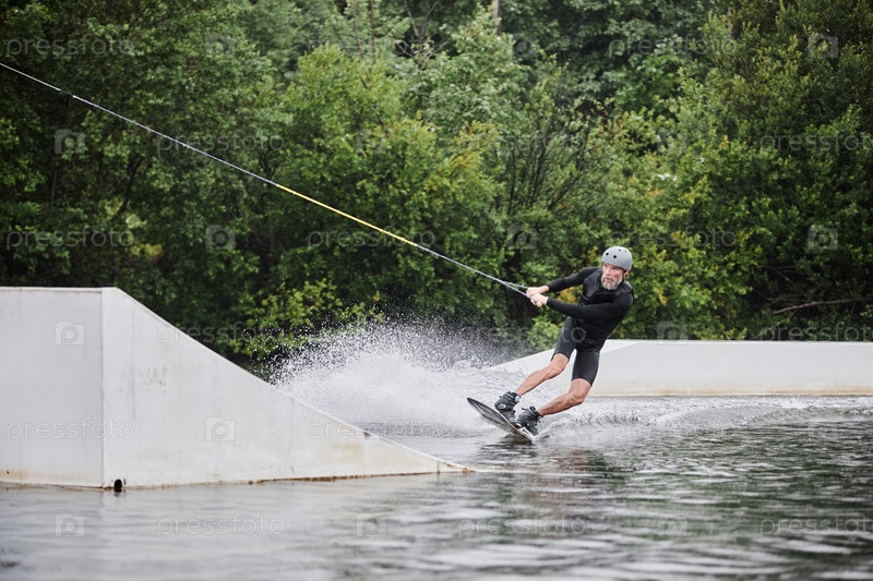 Бородатый мужчина Wakeboarding прыжки на пандусе с водяными брызгами