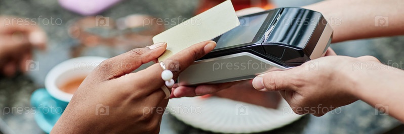 Header of Woman Tapping Card Заголовок женщины с карточкой