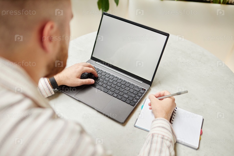 Человек печатает на ноутбуке и пишет в блокноте за столом в кафе