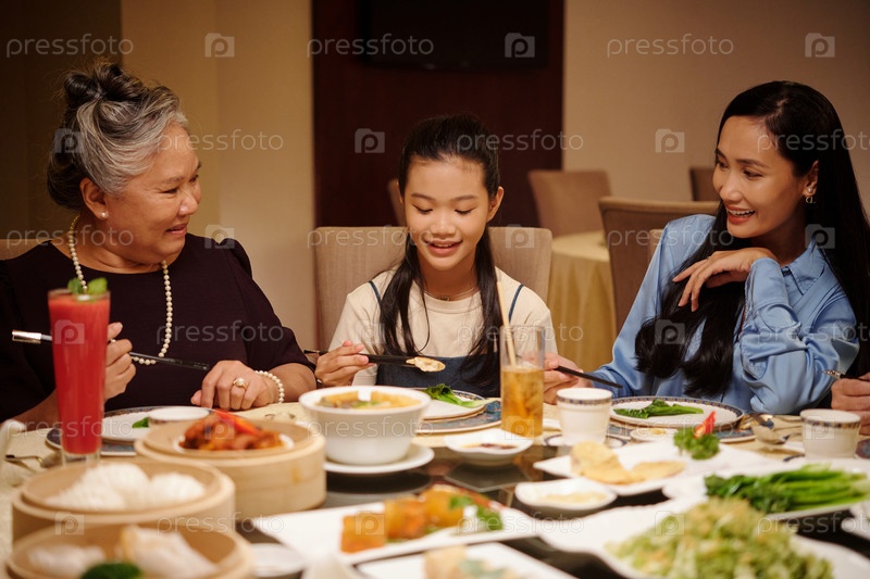 Девушка ужинает с семьей